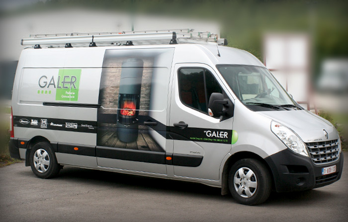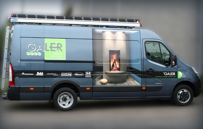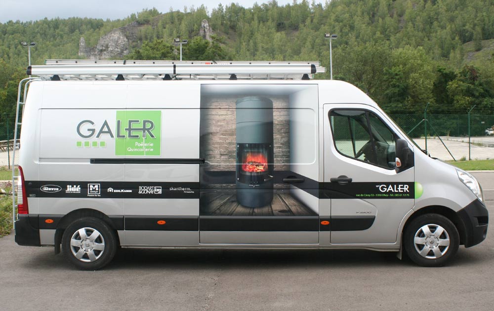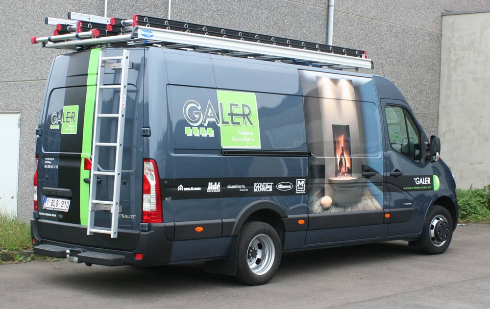 Pour l’entreprise GALER située à Ohey, Graphic Dimension a réalisé la conception graphique et le lettrage de deux véhicules utilitaires avec un visuel trompe-l’œil original. L’objectif était de transformer ces camionnettes en véritables supports publicitaires mobiles tout en valorisant l’activité de poêlerie et de quincaillerie de l’entreprise.