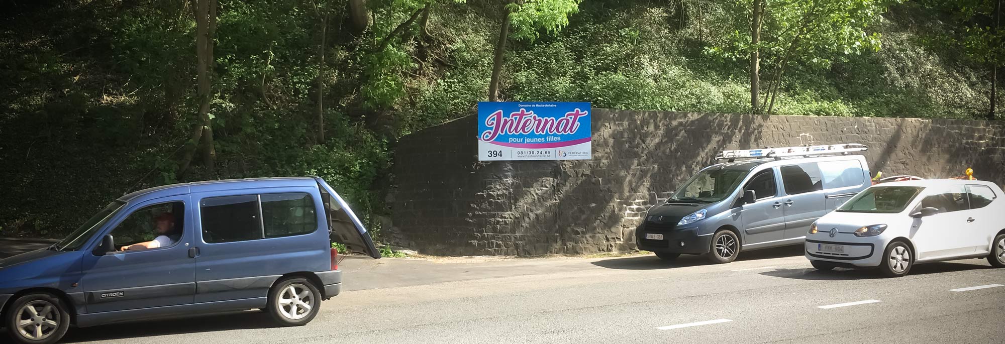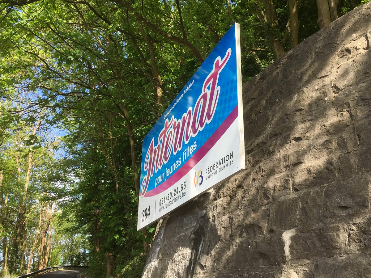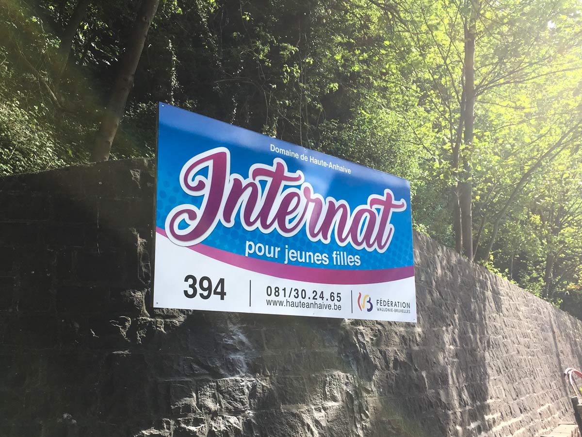 Situé à Jambes, près de Namur, l’Internat de Haute-Anhaive souhaitait améliorer sa visibilité grâce à un panneau publicitaire clairement visible depuis la voirie. L’objectif était de créer une signalétique attractive permettant d’identifier rapidement l’établissement et d’informer les familles de l’existence de cet internat pour jeunes filles.