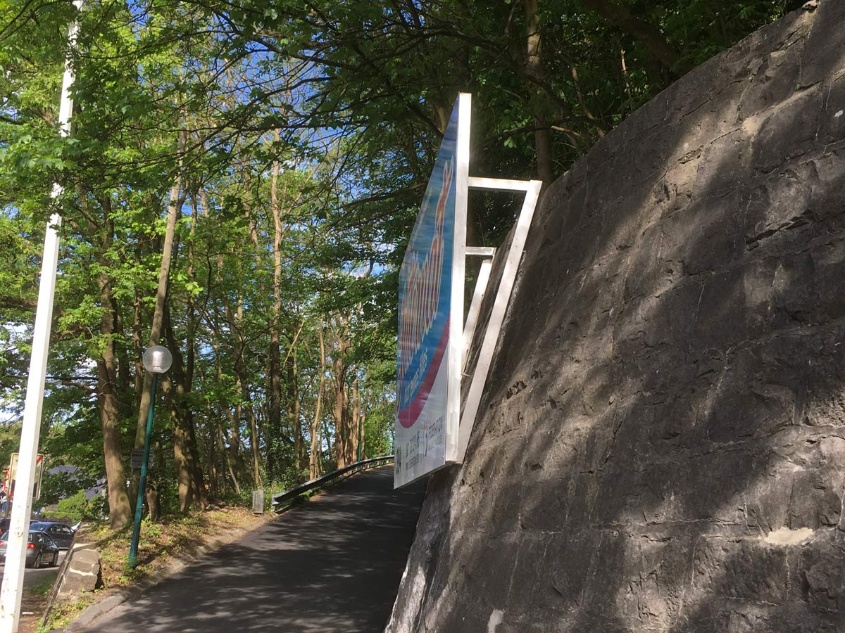 Ce projet présentait également une contrainte technique particulière. Le panneau devait être fixé sur un mur en pierre arrondi, ce qui nécessitait une solution de fixation spécifique. Graphic Dimension a donc conçu et réalisé une structure métallique sur mesure permettant d’adapter parfaitement le panneau à la courbure du mur tout en assurant solidité, stabilité et durabilité.